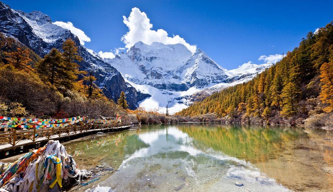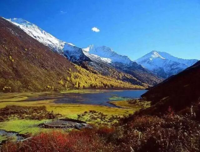 【四姑娘山】—被誉为"蜀山皇后",山麓森林茂密,绿草如茵,清澈的溪流潺潺不绝,宛如一派秀美的南欧风光,人称"东方的阿尔卑斯"。